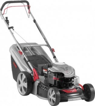 4-in-One Function: Mow, collect, Mulch and Side Discharge. Central, 7-stage Height Adjustment. 70l Collector with integrated Full Indicator. XXL-Wheels. With 1-Speed wheel drive. Includes Electric Start.